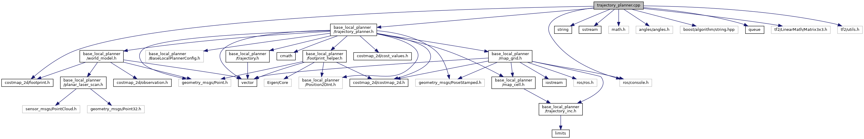 #include <base_local_planner/trajectory_planner.h>#include <costmap_2d/footprint.h>#include <string>#include <sstream>#include <math.h>#include <angles/angles.h>#include <boost/algorithm/string.hpp>#include <ros/console.h>#include <queue>#include <tf2/LinearMath/Matrix3x3.h>#include <tf2/utils.h>